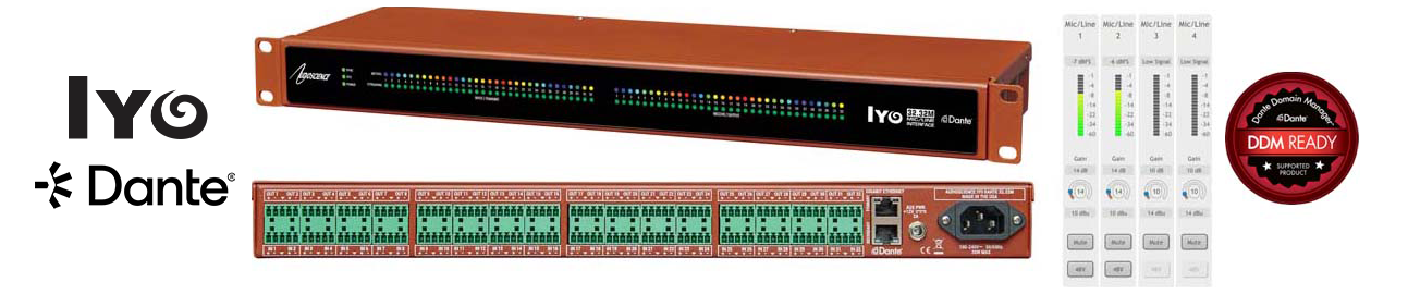 The Iyo Dante® is a cost-effective family of microphone/line Dante audio-over-IP (AoIP) interfaces in a 1U rack mount format. Seven models provide various configurations of balanced analog audio inputs and outputs. Each input accommodates microphone through line level signals with a gain range of -60 to +24dBu. +48V phantom power is individually switchable on each input. Output levels are configurable up to +24dBu.